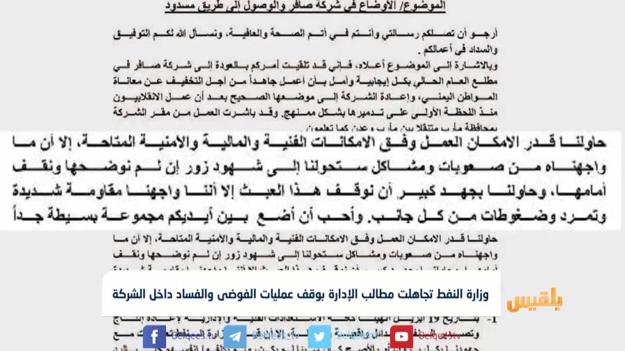 ووفقاً للوثائقِ التي حصلت عليها قناة بلقيس فإن نائب المدير العام لشركة صافر استحدث وظائفَ جديدةً مخالفةً للقانون.