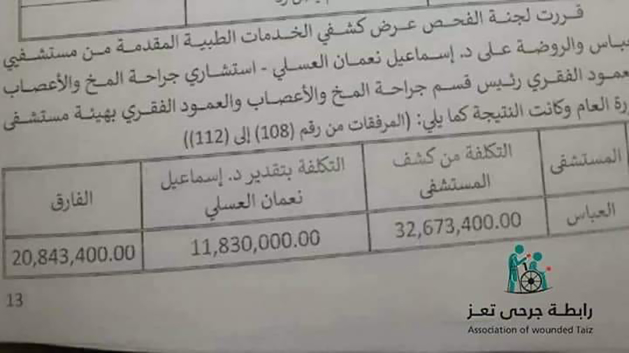 اتهامات من رابطة جرحى تعز لرئيس اللجنة الطبية بعدم التجاوب مع لجنة الفحص للسجلات المالية ورفض تقديم أي إخلاءات مالية حول مبلغ يقدر بمليون دولار، ناهيك عن اختلالات قانونية ومطالب بإحالة الملف إلى الجهاز المركزي للرقابة والمحاسبة ونيابة الأموال العامة.